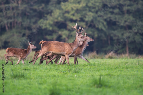 © Gabriel Cassan, Naklejka premium Deer herd running through an open meadow