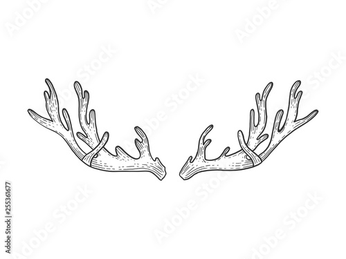 Obraz premium Deer horns sketch engraving vector illustration. Scratch board style imitation. Black and white hand drawn image.