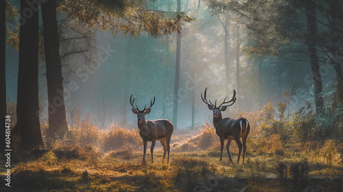 © DLC Studio, Obraz premium Deer in a field with trees in the background