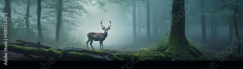 Obraz premium Deer in Misty Forest: A Mystical Encounter