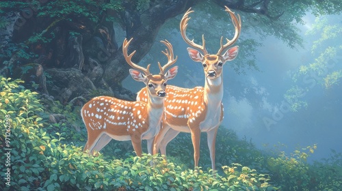 © Cdel, Fototapeta premium Deer in Serene Forest, A pair of spotted deer rests beneath an ancient tree, surrounded by lush greenery and a peaceful atmosphere, embodying nature's tranquility.