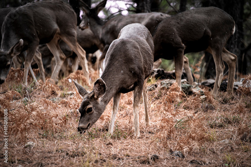 © fladhammer, Fototapeta premium Deer in the woods while snowing