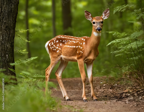 © Faheem, Fototapeta premium deer in the woods, White tailed deer fawn with hind on natural trail in north Wisconsin., white tailed deer