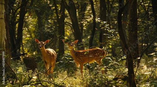 © Suleyman, Fototapeta premium Deer roam freely in the dense forest, their brown and white coats blending with the trees.