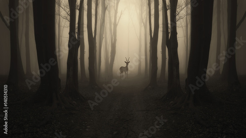 © andreiuc88, Fototapeta premium deer silhouette on forest path, dark surreal landscape