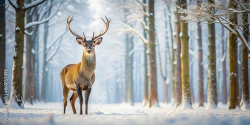 Fototapeta premium Deer standing gracefully in a serene snow-covered forest, winter, cold,...