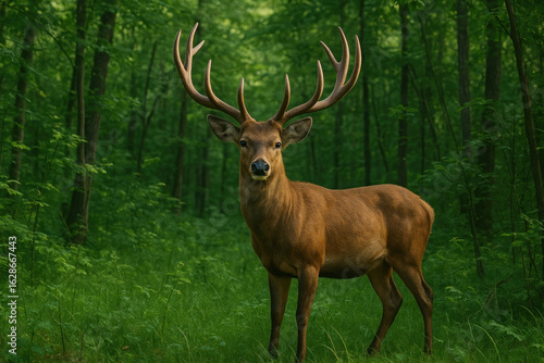 © Rinata, Fototapeta premium Deer standing in forest with tall grass.