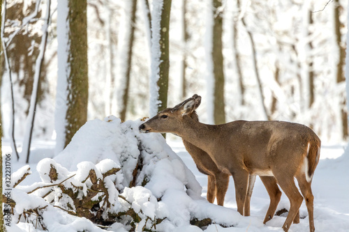 © Denny, Fototapeta premium Deer. White-tailed deer on snow . Natural scene from Wisconsin state park. Hind and older fawn.
