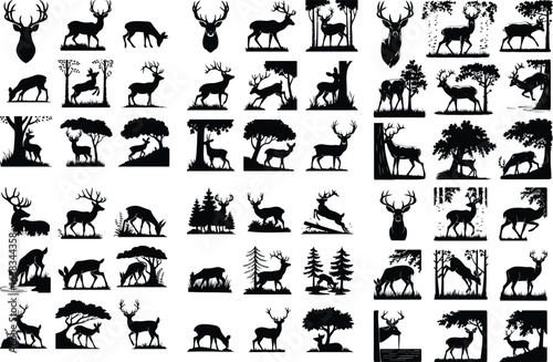 © logodesign11, Fototapeta premium Deer with Antlers in Forest Silhouette – Wildlife Icon Set Majestic Deer in Woods Silhouette – Nature Animal Icon