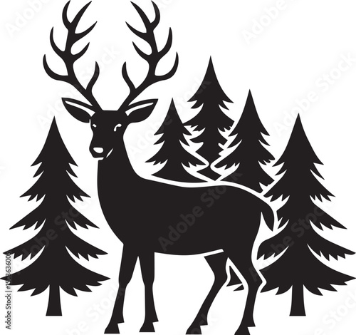 Obraz premium deer with pine trees and forest scenery silhouette vector icon, deer with pine trees and forest scenery illustration