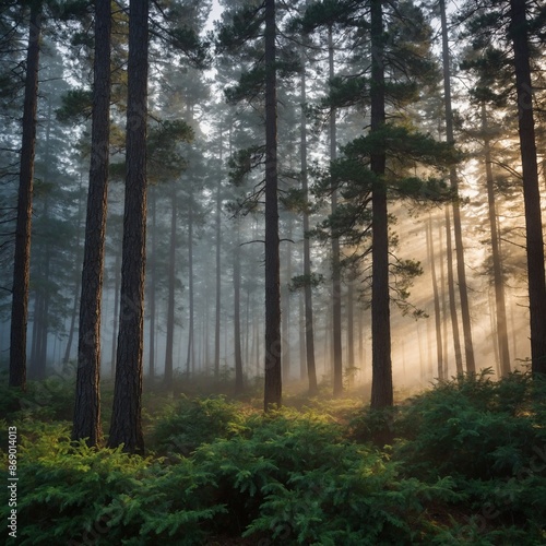 © Amjad, Obraz premium Default Mist curled gently around the towering pines creating