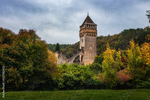 Naklejka premium Defensive tower of the medieval Valentre bridge in the city of Cahors,...