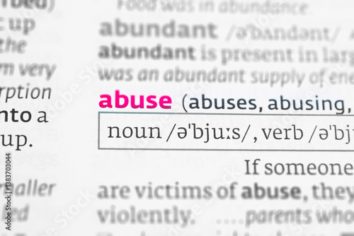 © daniiD, Fototapeta premium Definition of “abuse”. Explains misuse, maltreatment, harm, verbal/physical, dictionary meaning, negative behavior.