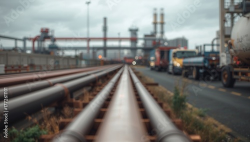 © The 2R Artificiality, Naklejka premium Defocused abstract background of pipe factory, industrial setting, operational efficiency