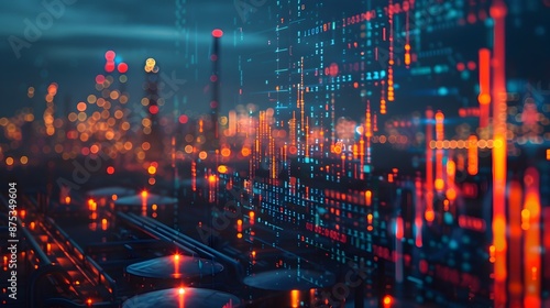 Fototapeta premium Defocused Cityscape with Digital Oil Refinery and Financial Data Display