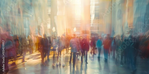 Fototapeta premium Defocused crowd at an exhibition hall, with bright light creating a blurry, abstract scene