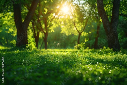 Fototapeta premium Defocused green trees in forest or park with wild grass and sun beams. ai...