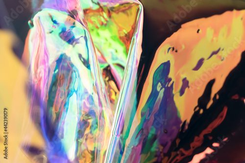 © rorygezfresh, Fototapeta premium Defocused iridescent holographic background. Blurred colorful texture of wrinkled foil.