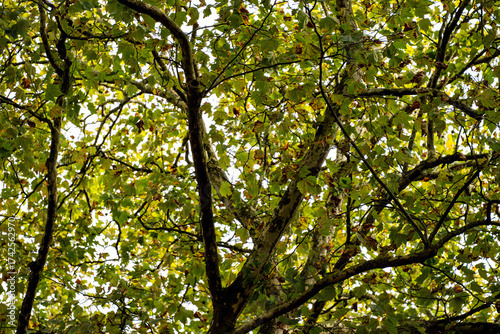 © Lyudmyla, Fototapeta premium Defocused photo bokeh glare of light on trees trees on sky background open space park
