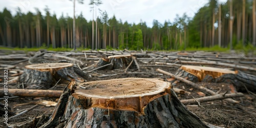 © Anastasiia, Obraz premium Deforestation Clearcut forest with stumps and fallen trees showing impact on climate. Concept Environmental Destruction, Deforestation, Climate Change Impacts