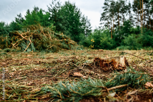 © Natallia, Obraz premium Deforestation, forest clearing in summer time.
