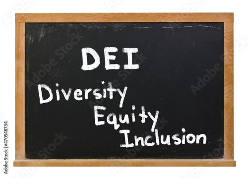 © clsdesign, Obraz premium DEI Diversity Equity Inclusion written in white chalk on a black chalkboard isolated on white