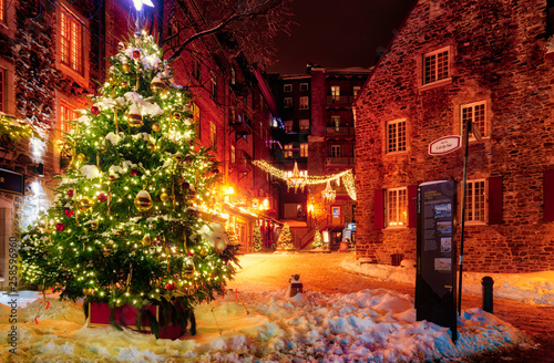 Obraz premium Dekoracje świąteczne i świeży śnieg w dzielnicy Petit Champlain w Quebecu w...