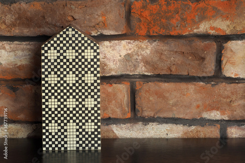 © vofchok, Obraz premium Dekoratywny domek w czarno-białe kwadraciki na tle ściany z cegieł