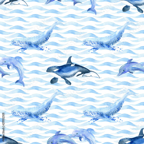 Fototapeta premium Delfin, rekin, wieloryb, orka akwarela raster bez szwu