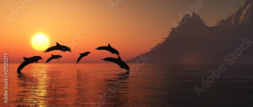 © ustas, Obraz premium Delfiny skaczą o zachodzie słońca. Morze krajobraz przy zmierzchem. Renderowanie 3D