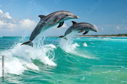 © Phurichai, Naklejka premium Delfiny skaczące fale oceanu morskie zwierzęta wodne ssaki turkusowa woda letnia zabawa natura