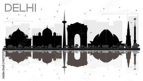 Obraz premium Delhi City skyline black and white silhouette with reflections.