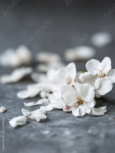 © Generative AI, Fototapeta premium Delicate and Beautiful White Flower Petals Lying on a Gray Stone Surface : Generative AI