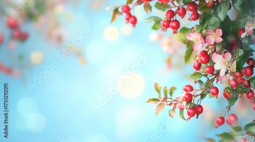 Fototapeta premium Delicate apple blossoms and vibrant red crabapples against a dreamy azure backdrop