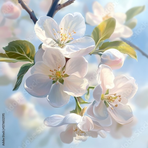 Obraz premium Delicate apple blossoms create a serene atmosphere in a realistic digital...