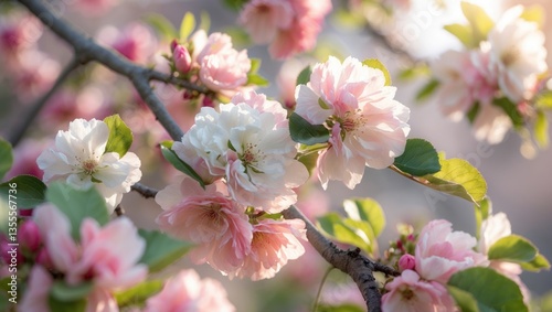 © AImmersive Imagery, Obraz premium Delicate apple blossoms in soft shades of pink and white embellish branches.