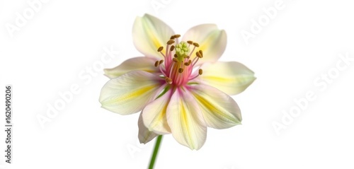 Fototapeta premium Delicate aquilegia bloom, vibrant petals, isolated on white, stem, plant