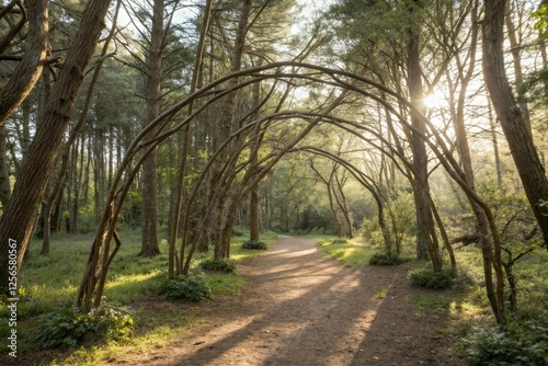 © Phetthanousack, Obraz premium Delicate arches formed by slender tree branches in a sunlit forest clearing, organic shapes, greenery, leaves