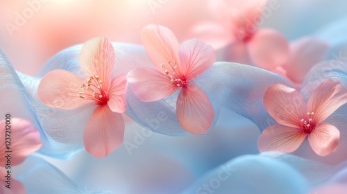 © GH, Fototapeta premium Delicate arrangement of pink flowers and soft fabric on a light background