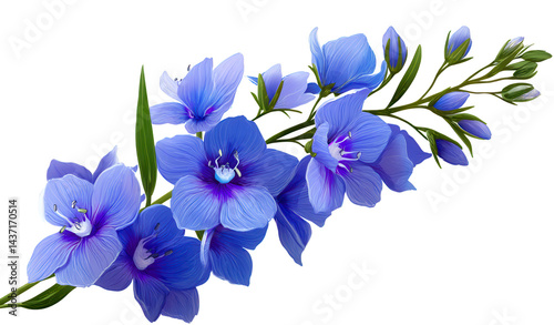 © pattaphorn, Fototapeta premium Delicate Arrangement of Vibrant Blue Flowers with Green Leaves on Transparent Background