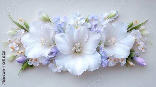 Obraz premium Delicate arrangement of white and pastel flowers with green leaves on a soft...