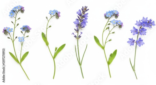 © stock.metket.com, Fototapeta premium Delicate arrangement of wildflowers on a white background with lush green leaves and vibrant petals