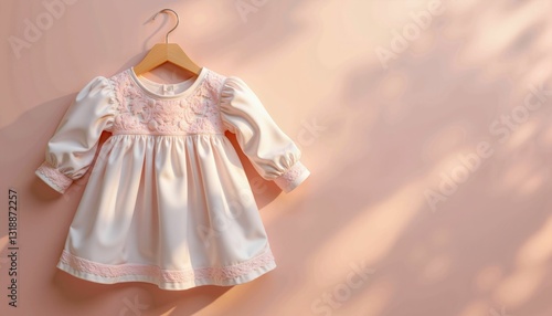 Obraz premium Delicate baby dress with lace details hanging on a wooden hanger in soft...