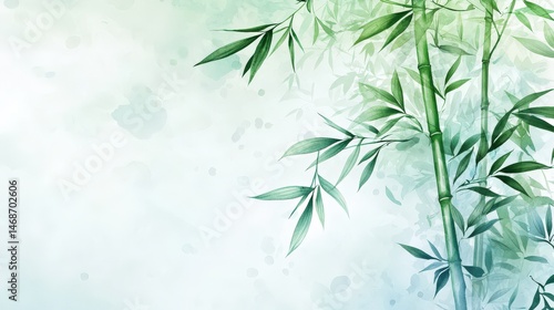Naklejka premium Delicate bamboo stalks rise from a misty watercolor wash, while leaves float freely in the negative space, creating a soft, serene environment