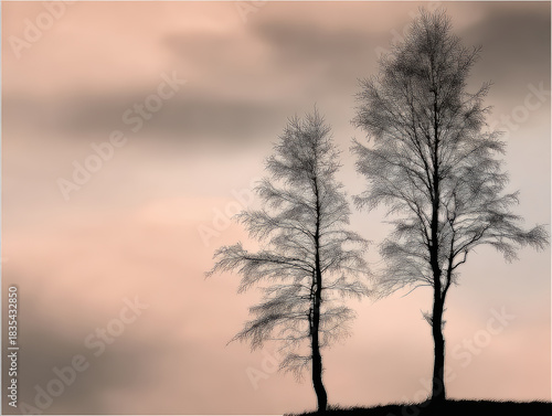 © 5_Billionaires, Obraz premium Delicate birch tree silhouette at sunset with soft pink sky and wispy clouds conveying calm