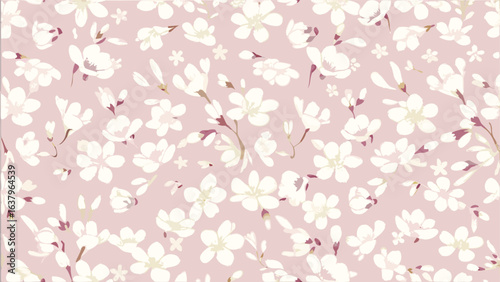 Obraz premium Delicate blossom pattern with white flowers and subtle foliage on a pastel pink background design theme