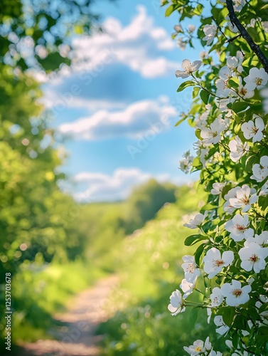 © Tahira, Obraz premium Delicate blossoms on the right side, surrounded by lush greenery and a dreamy blue summer sky.