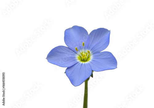 Fototapeta premium Delicate blue five-petal flower, bright yellow center, dark stamens,...