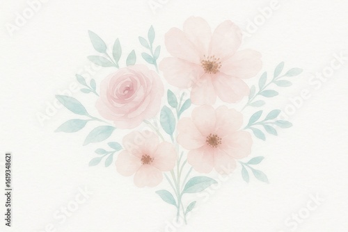 © Sergey, Fototapeta premium Delicate blush pink flowers and green foliage painted in watercolor style on white background, symbolizing elegance and romantic nature