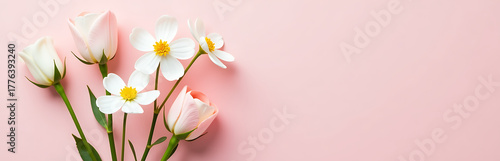 © fotoluigi868, Fototapeta premium delicate bouquet white flowers rests soft creamy pastel pink backdrop serene overhead flat lay